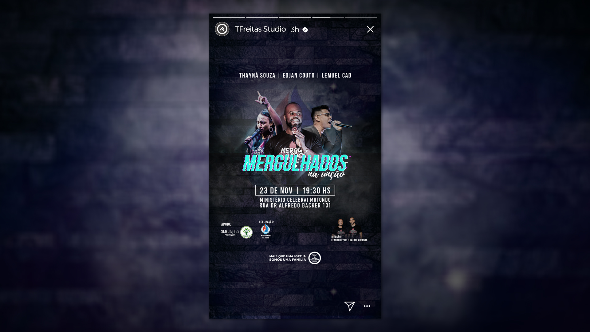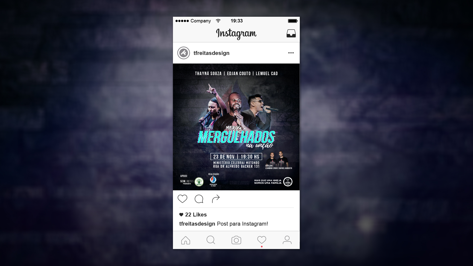 Produção de material gráfico para o evento Mergulhados na unção, realizado em novembro de 2018. O projeto consistiu na produção de artes para mídias sociais (post/stories), utilizadas para a divulgação do evento, além de um motion graphics utilizado no sistema multimídia durante o evento.